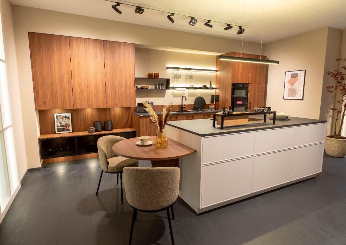 Die Integration der Hausgeräte wurde ebenfalls weiterentwickelt. Flächenbündig eingebaute Backöfen, Dampfgarer und Kühlgeräte schließen optisch an die umliegenden Fronten an. Die Griffvarianten folgen einer klaren Linie. Grifflose Fronten mit eingefrästen Griffleisten sind weiterhin das bevorzugte Mittel, um das Linienbild ruhig zu halten. Durchgangstüren mit senkrechter Kehlleiste und passende Wohnmöbel wie taste south! No. 9 erweitern den Gestaltungsrahmen bis in den Wohnraum hinein. So entsteht ein durchgängiges Einrichtungskonzept, in dem Küche, Wohnraum und Hauswirtschaftsbereich eine gemeinsame Sprache sprechen.